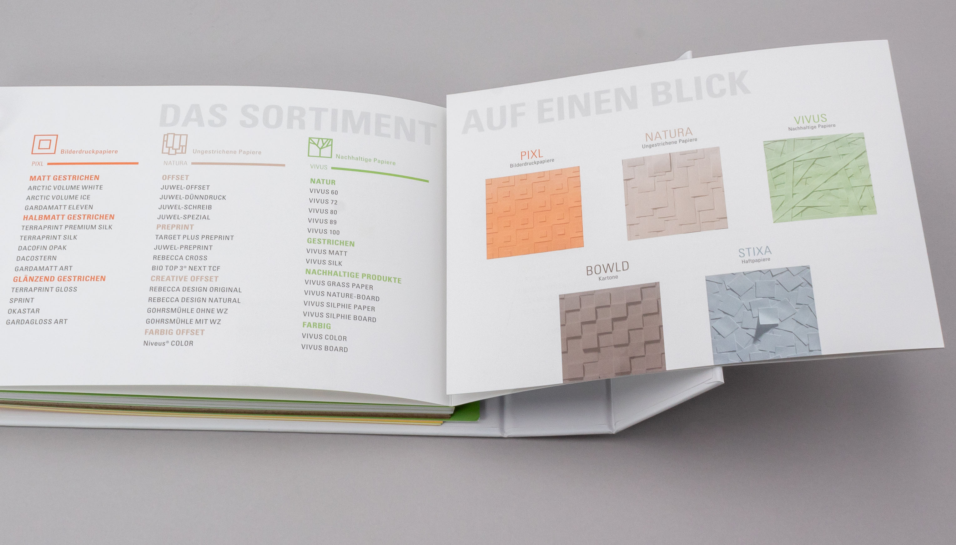 Damit Sie einen genauen Überblick über die unterschiedlichen Sortimentsbereiche bekommen, haben wir alles in einer Musterkollektion zusammengefasst. Die breite Auswahl an Papier- und Kartonqualitäten sowie das vollständige Produktsortiment in der Kollektion bietet Druckereien, Verlagen, Agenturen und Designern passgenaue Lösungen für ihre spezifischen Anforderungen.